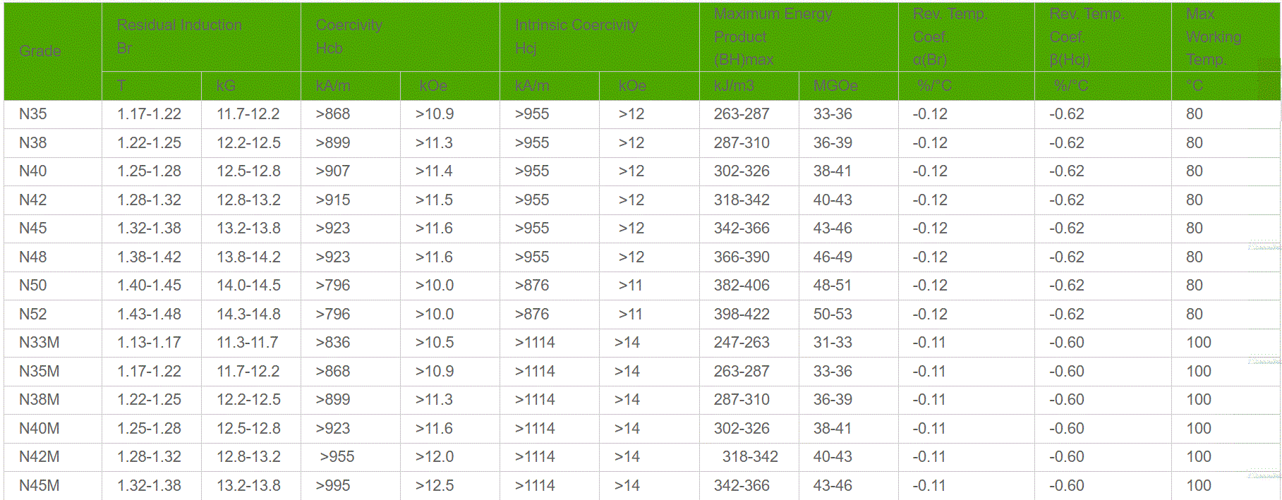 The letters indicate the magnet’s maximum operating temperature and intrinsic coercivity (Hcj) . Intrinsic coercivity measures a magnet’s resistance to demagnetization: the higher the value, the better the stability.